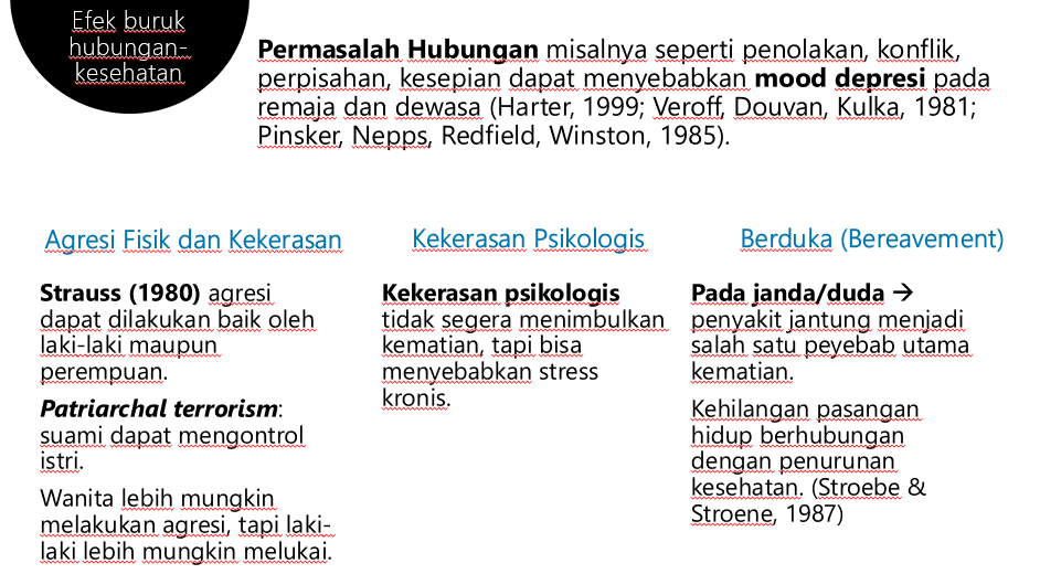 Selain berdampak positif pada kesehatan, permasalahan hubungan misalnya seperti penolakan, konflik, perpisahan, kesepian justru dapat menyebabkan mood depresi pada remaja dan dewasa (Berscheid & Regan, 2005). Selain itu, dinamika hubungan seperti agresi baik fisik maupun psikologis dapat menyebabkan kematian dan stres kronis (Brescheid & Regan, 2005). Demikian juga proses berduka saat ditinggalkan oleh pasangan, atau hewan peliharaan berhubungan dengan penurunan kesehatan dan peningkatan stres (Brescheid & Regan, 2005).