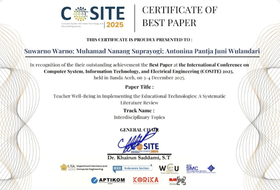 The award reflects the strong scholarly impact of the research, particularly its contribution to understanding how educators adapt to technological demands while maintaining psychological well-being. Co-authored with Suwarno and Juni Wulandari, the paper was commended for its rigorous analysis and significance to global educational discourse.
