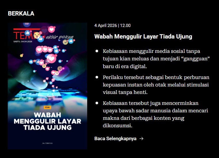 Apa yang harus dilakukan untuk mengantisipasi kondisi tersebut? Simak selengkapnya dalam TEMPO Akhir Pekan Juneman Abraham yang berjudul “Fenomena Menggulir Layar Media Sosial“. ●